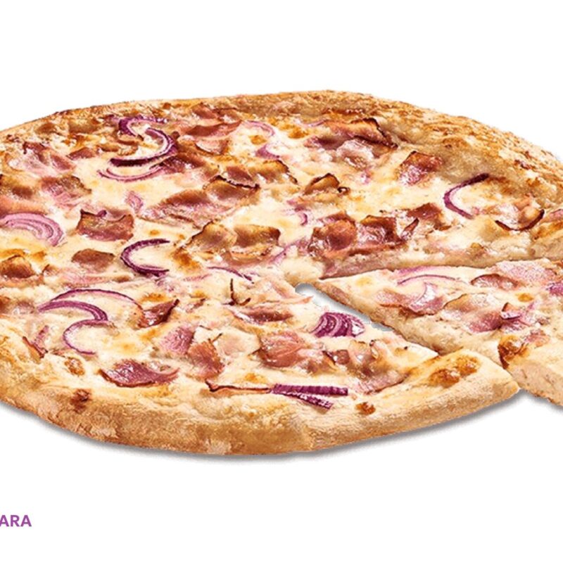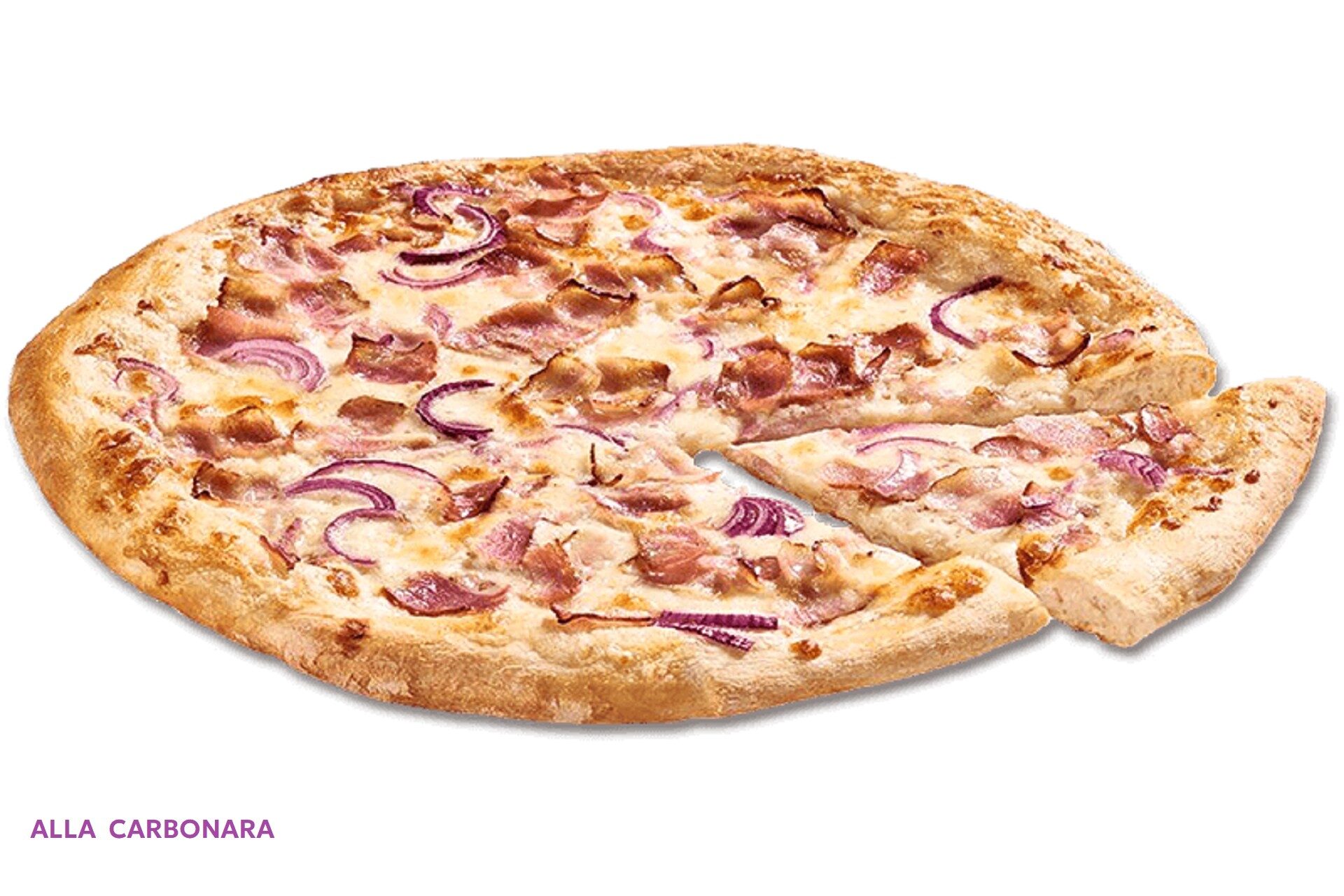 ALLA CARBONARA - mírně pikantní Crème Fraîche omáčka, nakrájená slanina, červená cibule, mozzarella a směs bylinek.