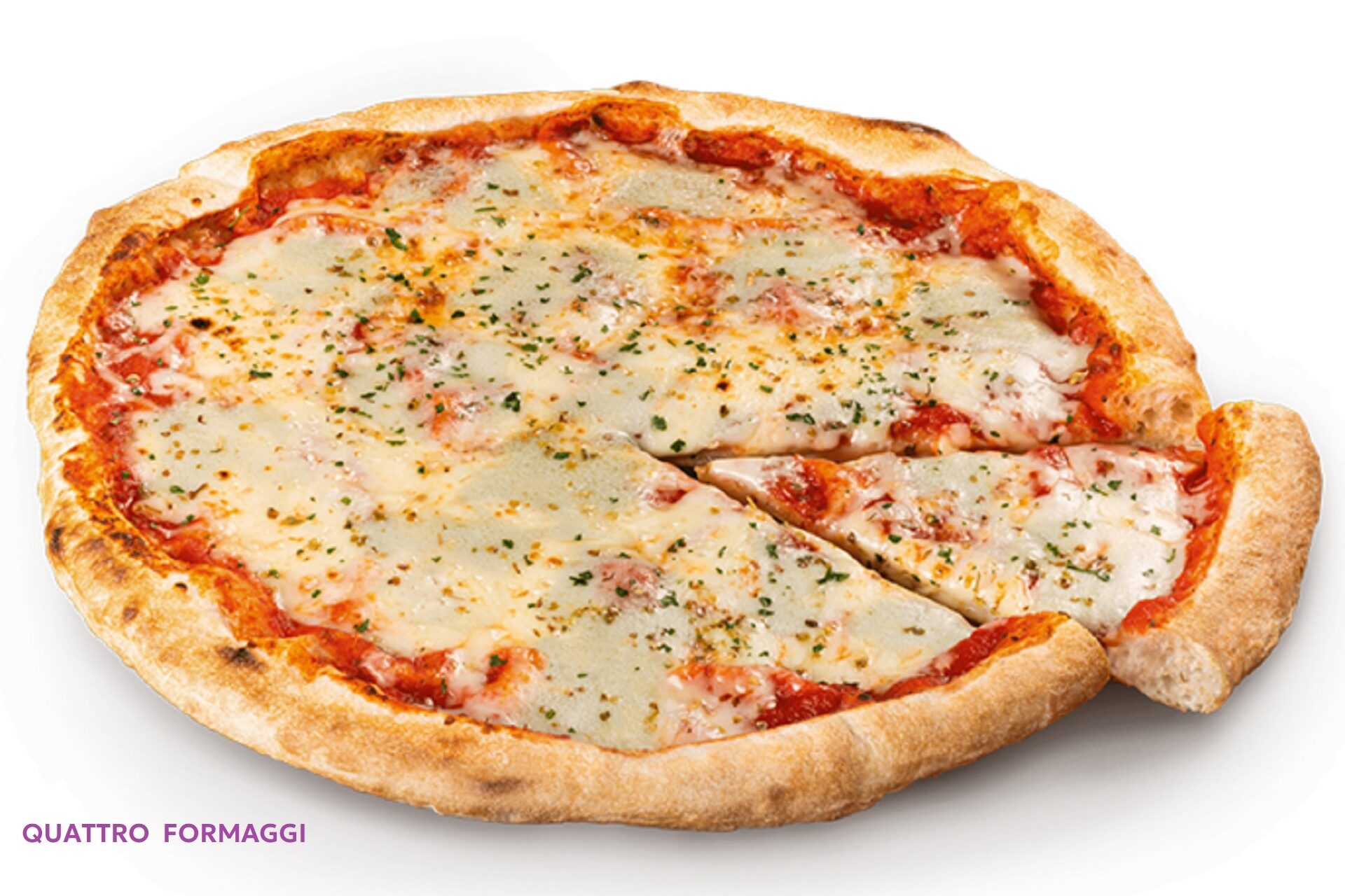QUATTRO FORMAGGI - rajčatová omáčka, směs bylinek a sýry: ementál, provolone, s modrou plísní a mozzarellou.